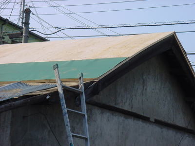 下地のコンパネを打ったところ、下の緑色の物はアスファルトル-ヒング(防水紙)です。