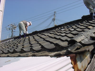 屋根瓦を降ろしています。約10坪(33平米)屋根瓦と葺き土で2tトラックで大方2台分ありました。