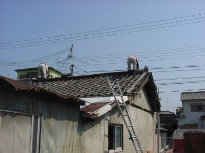 屋根瓦を降ろしています。約10坪(33平米)屋根瓦と葺き土で2tトラックで大方2台分ありました。
