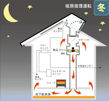 | 冬の朝、日射があり棟温度が28℃以上になると、ダンパーが開き,取込ファンがまわり、温風の取込みがはじまります。同時に床下に蓄熱をします。 そして、トイレを含め家の隅々まで暖かくなります。 夜は、蓄熱層の放熱で室温を保ちます。 | 暖房循環運転 昼間日射がなく寒いときや、夜間に蓄熱が足りないときに、ストーブを焚いて循環運転をさせると、ストーブの熱を家中に広げることができます。一部の床だけを暖める床暖房とは違い、家中が快適です。温水ボイラー、エアコン等いずれの熱源でも機能します。温水ボイラーでは、室温は自動制御となります。 |