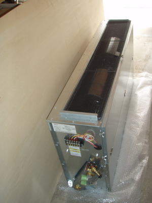 | ファンコンベクターを据え付けた例。 この現場ではカウンターの下に据え付けました。通常このような機械は床下に設置する場合が多いのです。あまりスマートとは言えませんが、機械のメンテナンスを考えれば床から上に設置した方がよいと思います。 CCFシステムでは床上に置くのが標準です。 |